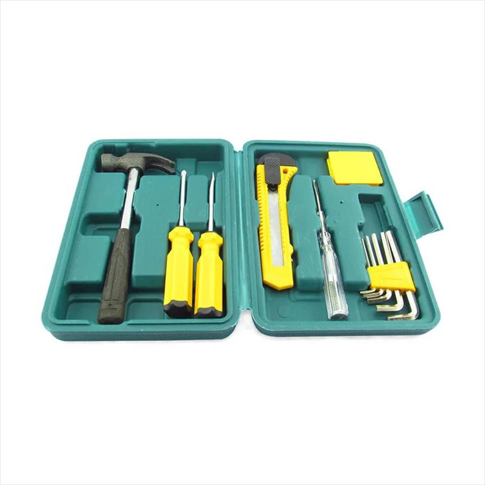 Juego de herramientas: bisturí, llaves bristol, metro, martillo, tester y destornilladores.