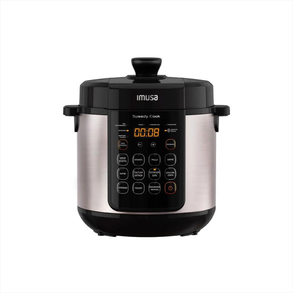 La Olla multifuncional Speedy Cook de IMUSA cuenta con una potencia de 900 Watts, que se traduce en un ahorro de tiempo y permite un mejor resultado en las preparaciones. Tiene 10 controles de seguridad y no permite abrir mientras hay presión. Cuenta con 10 programas preestablecidos, para preparar esas recetas que tanto te gustan, 5 litros de capacidad y cuerpo en acero inoxidable. Incluye tazón esférico, vaso dosificador, cuchara y vaporera. Programa la Speedy Cook para que comience a funcionar en el momento que lo necesites.